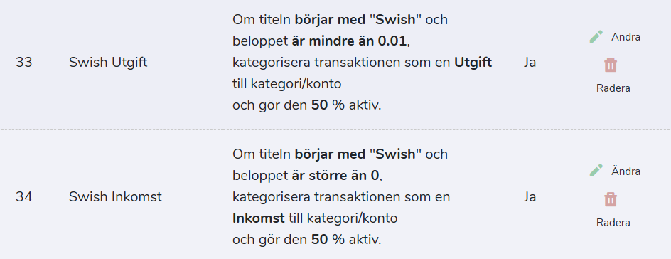 Har en regel som ändrar transaktionstyp på Swish-belopp under 0 kr till utgift (istället för överföring som verkar vara default) och vice versa.