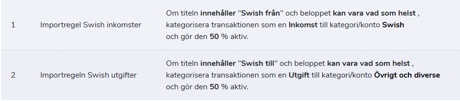 Tink har svårt för Swish, därav är importregler som den ovan ofta en bra lösning för att lösa majoriteten av transaktionerna.