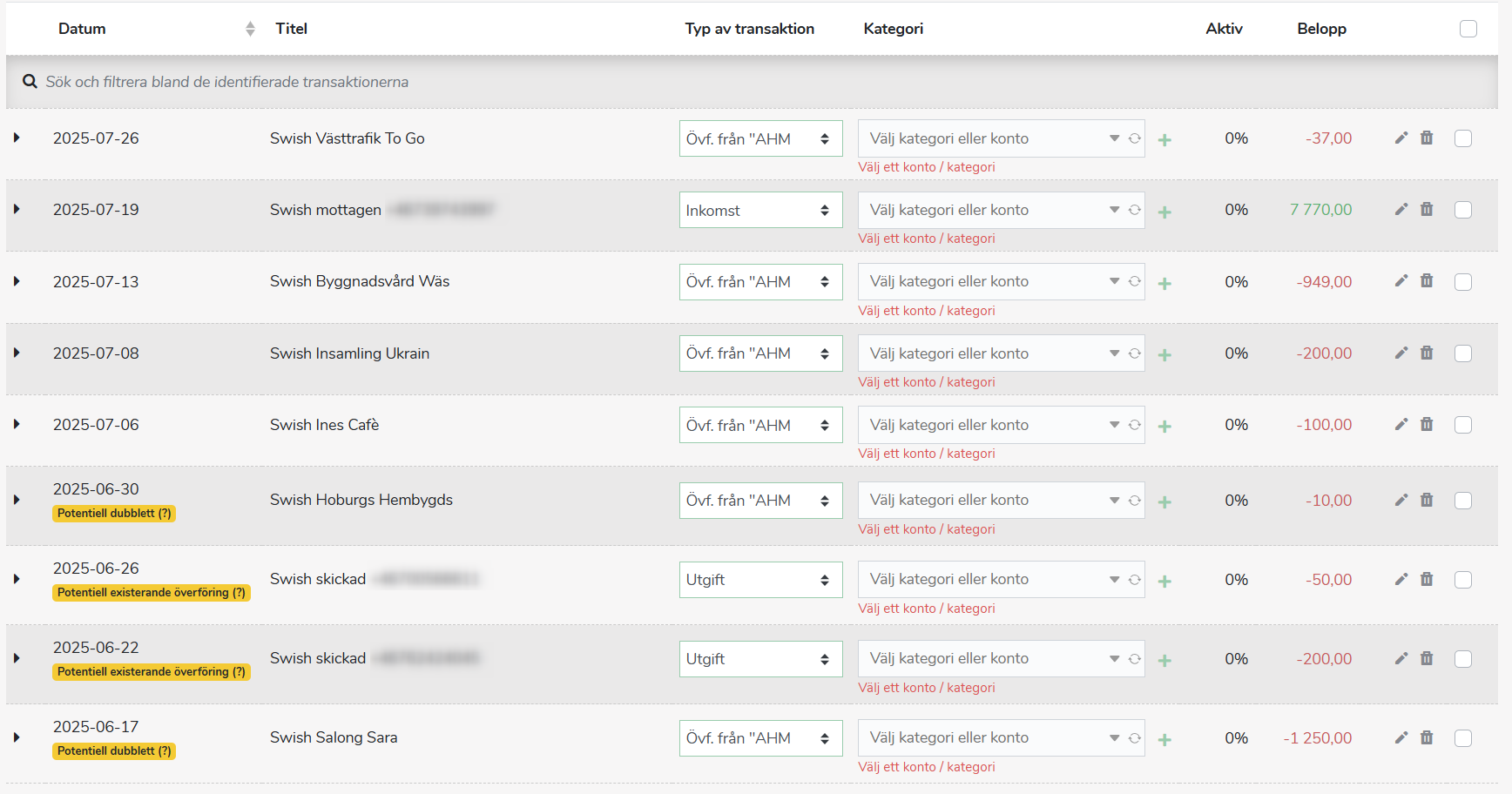Jag är fortfarande brydd över mina importer av swish-transaktioner som blir tolkade som överföringar mellan konton. Är det bara för mig eller vad är förväntat beteende egentligen? @janbolmeson, kan du kolla på min beskrivning ovan och berätta vad jag kan förvänta mig eller hur jag ska ställa in ett filter så att transaktionerna tolkas som inkomst eller utgift?