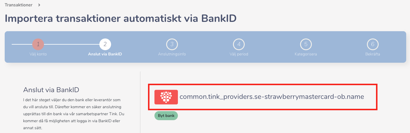Jag har idag 2026-02-02 problem att importers från Strawberry kortet via Tink.