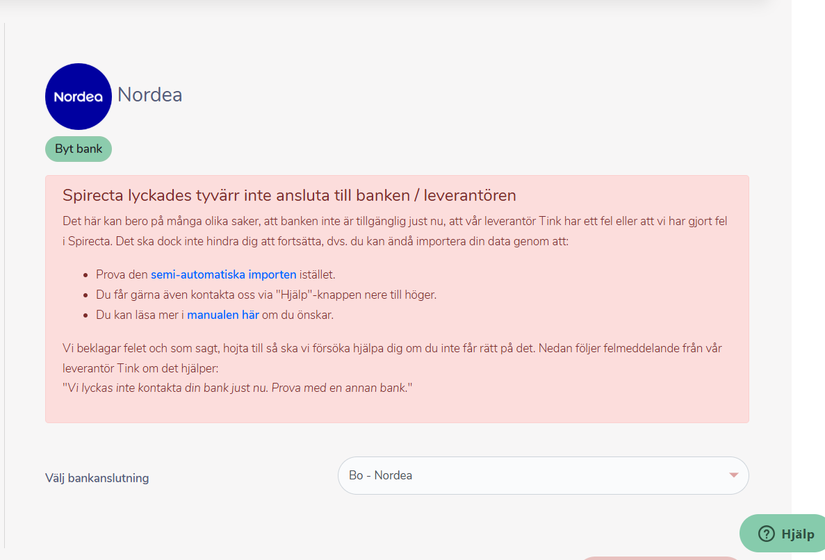 Om det inte fungerar kan du behöva radera kopplingen och återansluta den via inställningar > min data > bankanslutningar > radera kopplingen.